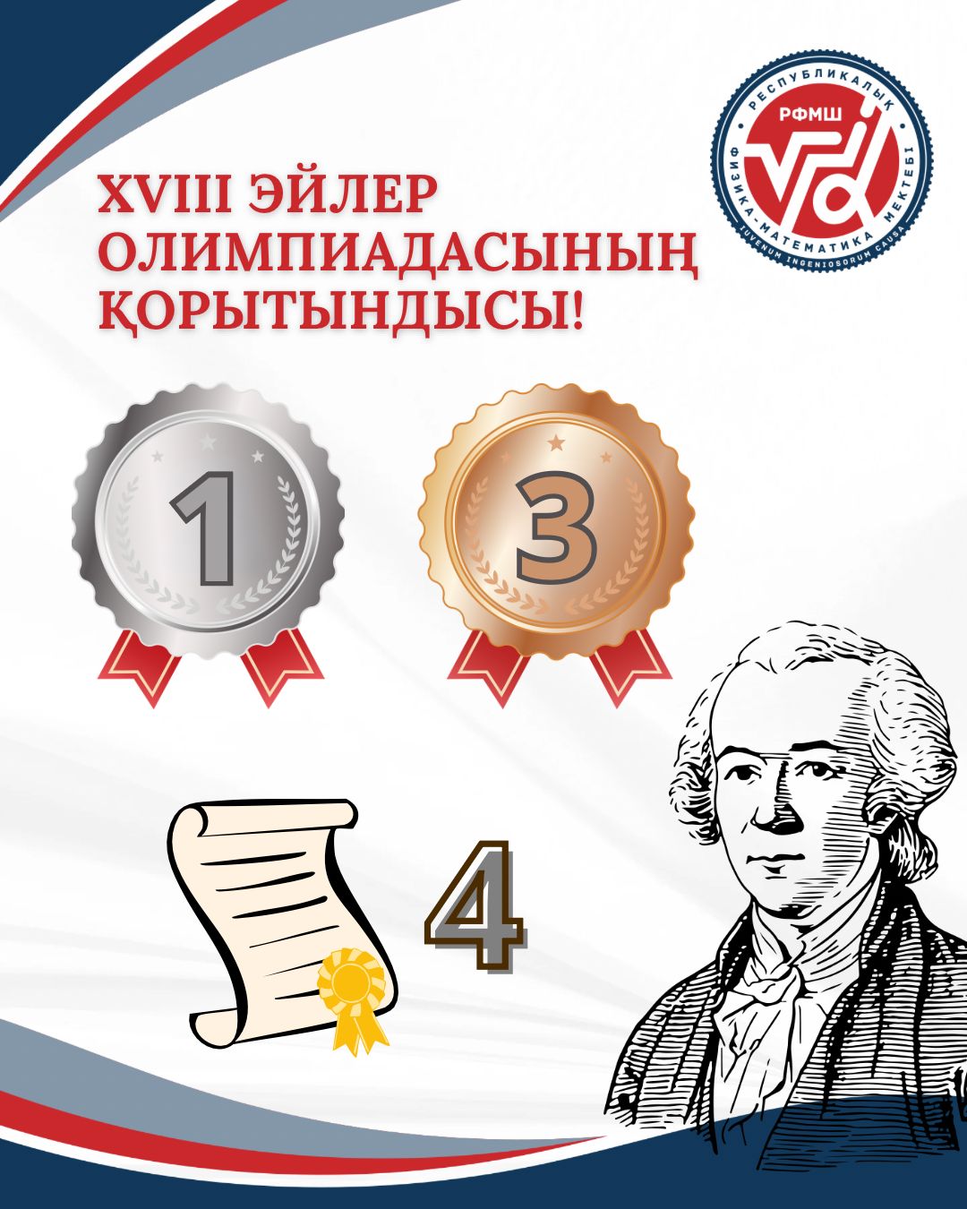Леонард Эйлер атындағы XVIII олимпиаданың қорытындысы бойынша Алматы қаласындағы РФМШ оқушылары жоғары нәтиже көрсетіп, 1 күміс медаль, 3 қола медаль және 4 мақтау грамотасын иеленді.